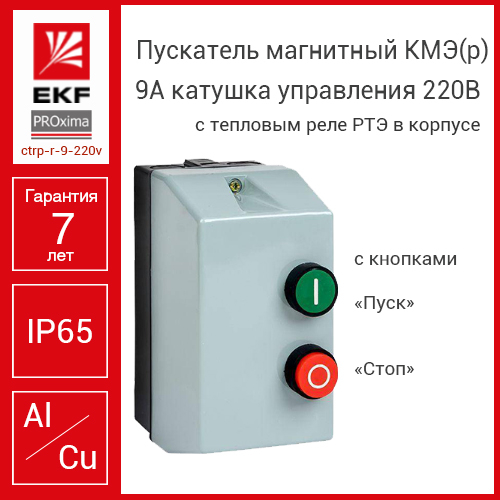 Пускатель магнитный КМЭ(р) 9А катушка управления 220В АС IP65 с кнопками П+С 1НО РТЭ-2355 9А предназначен для дистанционного пуска и остановки трехфазных асинхронных электродвигателей с короткозамкнутым ротором, работающих от сети переменного тока напряжением до 230В. Данная модель оснащена катушкой управления на 220В AC и защищена по стандарту IP65, что позволяет использовать устройство в условиях повышенной влажности и запыленности.